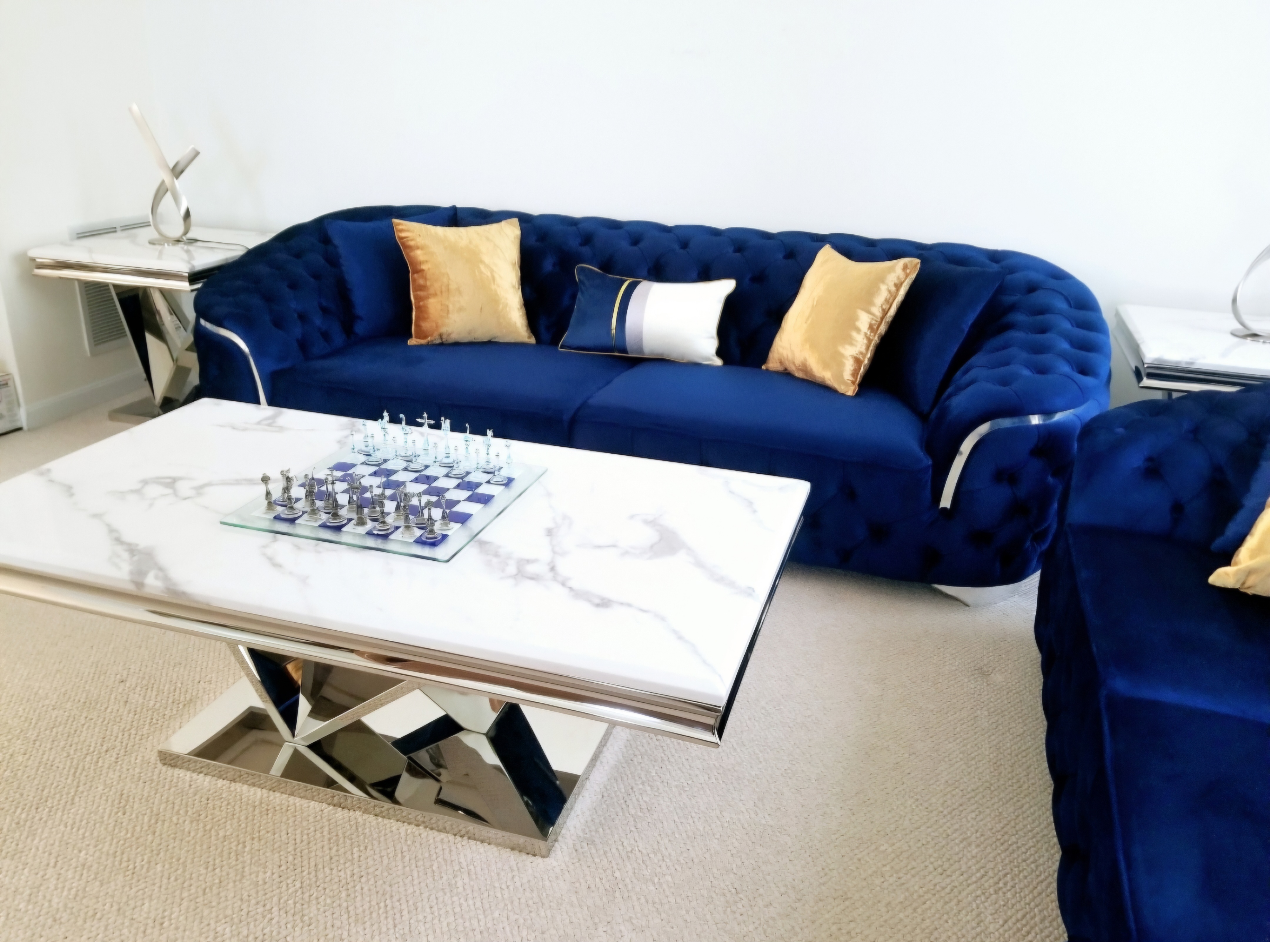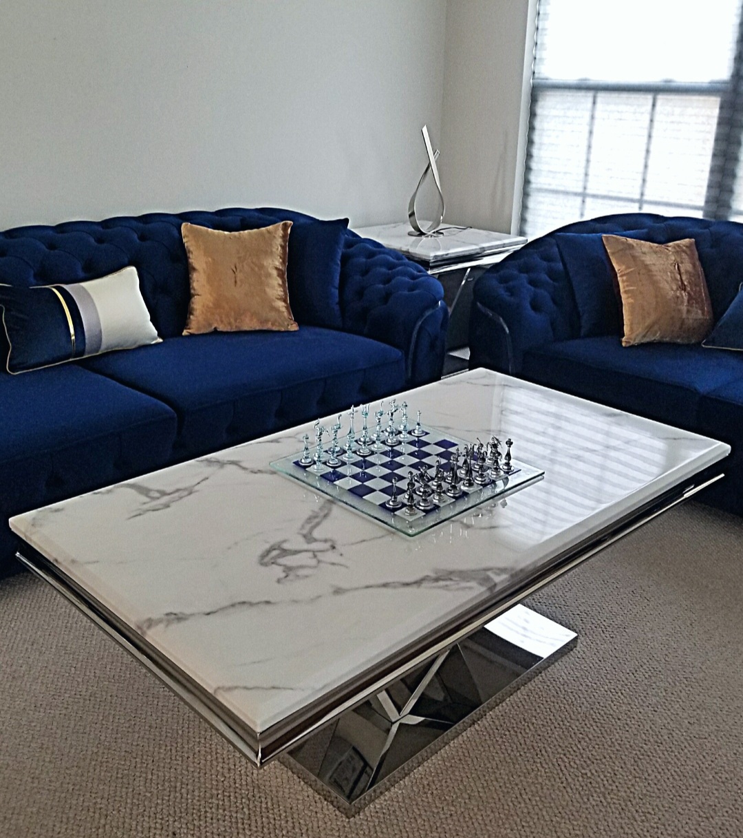 MODERN LOOK AND QUALITY AT AN AFFORDABLE PRICE... : I purchased this table set some time ago (1 coffee table and 2 end tables). First I must say that the customer service was impeccable. When it was delivered I unfortunately had 2 of the tops that were cracked. Contacted Classy Home and without any hesitation whatsoever, new tops were ordered for a replacement. As far as the tables go, they are absolutely stunning! The marble (look) tops are elegant with a very nice gloss finish and the metal bases are clean with a nice geometrical like styling. They were very easy to assemble with good user friendly instructions. I would hope for future customers that this set comes back in stock because for the look and quality at this price point, its more than worth it.